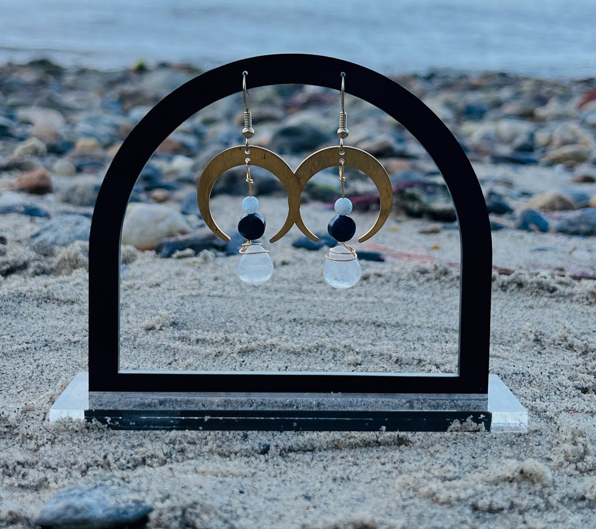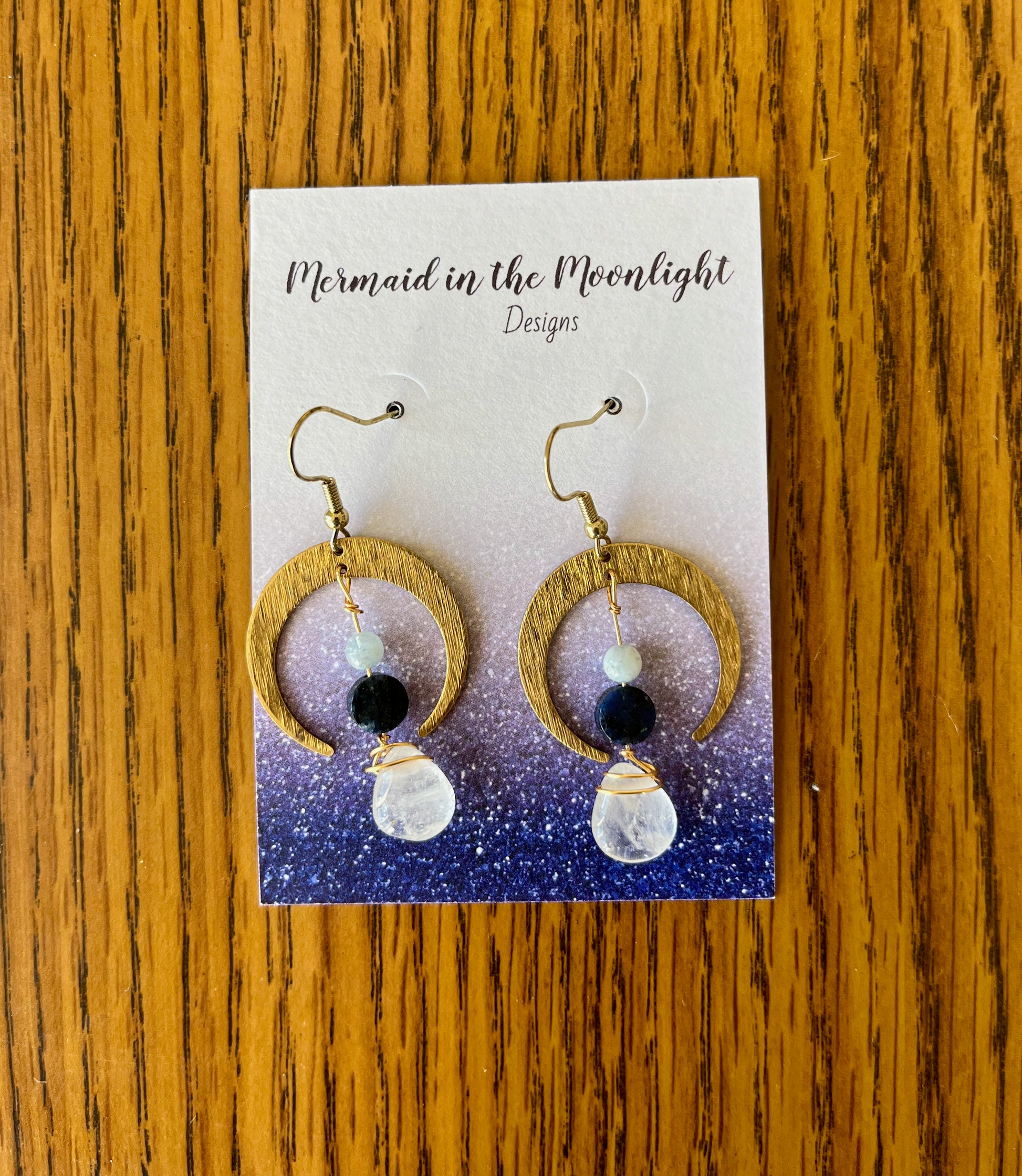 This pair combines the lesser known, but still powerful, dumortierite with aquamarine and quartz to enhance intuition and ease a worried mind. The moons are made from brass pieces and the hooks are gold plated hypoallergenic.