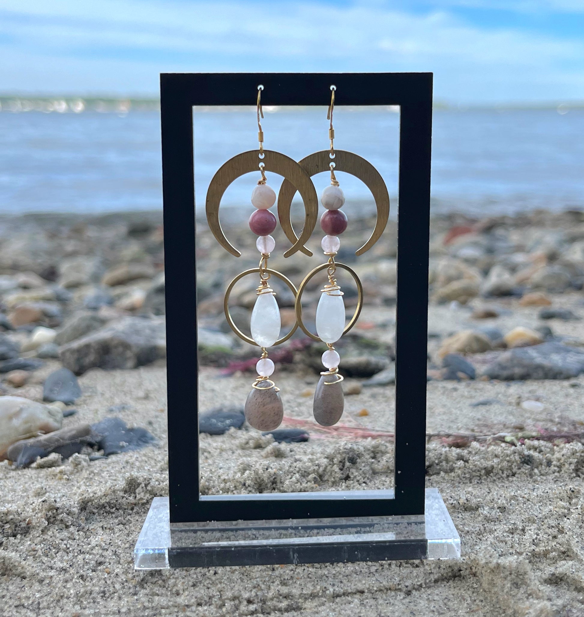 These beauties are designed to cultivate a deep self love, especially during difficult times and times of change. They include rose quartz, rhodonite , white moonstone, and gray moonstone to really open to the truth and clarity inside of you in a loving gentle way. The earrings are crafted with brass pieces and gold plated hypoallergenic hooks.