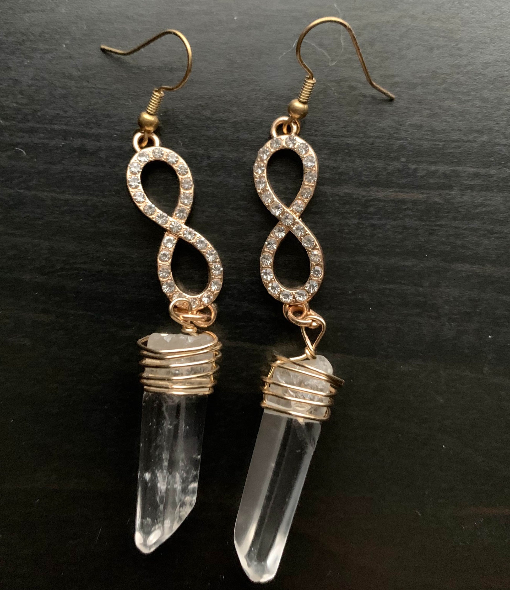 These earrings are created with infinity beads and quartz points to provide the wearer with infinite clarity throughout the day. Created with nickel free hooks.