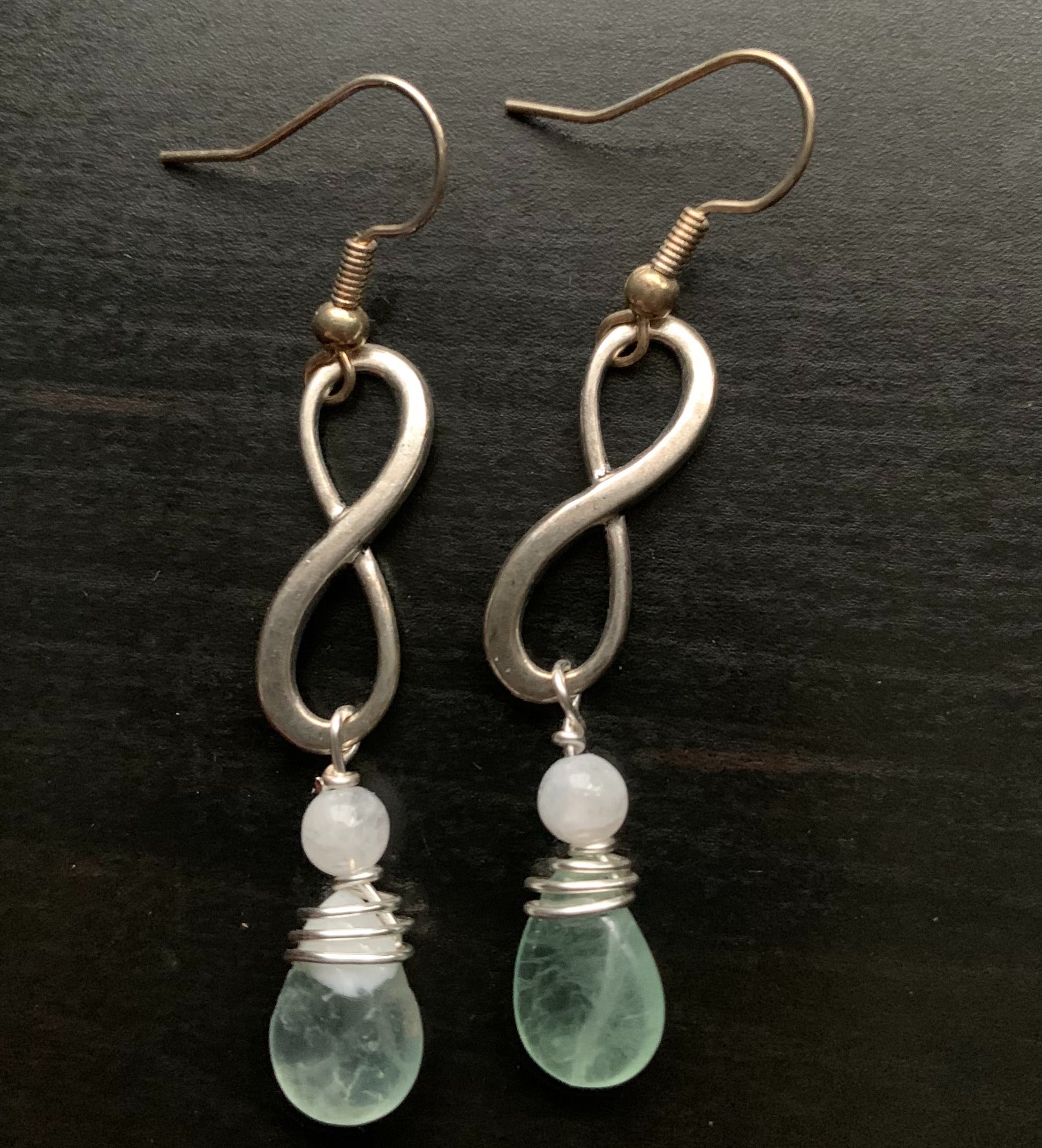 These are created with silver infinity beads, moonstone, and flourite drops to neutralize negativity and make space for connection to self and others. Made with nickel free hooks.